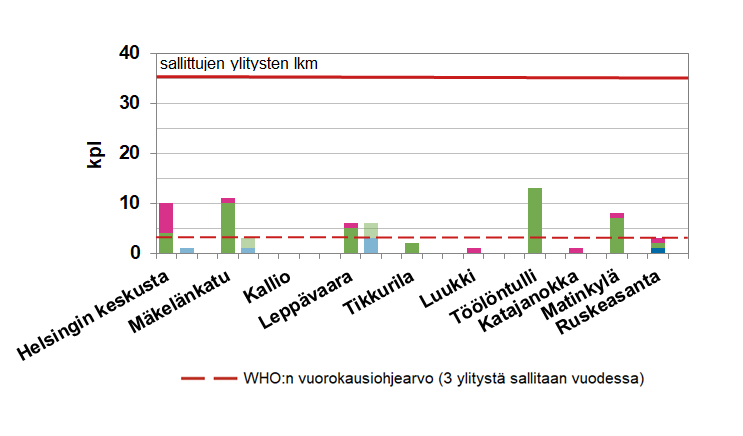 Hengitettävien hiukkasten raja-arvotaso on ylittynyt tänä vuonna tammi-toukokuussa Töölöntullissa 13, Mäkelänkadulla 10, Matinkylässä 7, Leppävaarassa 5, Mannerheimintiellä 4, Tikkurilassa ja Ruskeasannassa 2 päivänä (kuva 2.8). Raja-arvotaso ei ole ylittynyt Luukissa, Kalliossa eikä Katajanokalla.