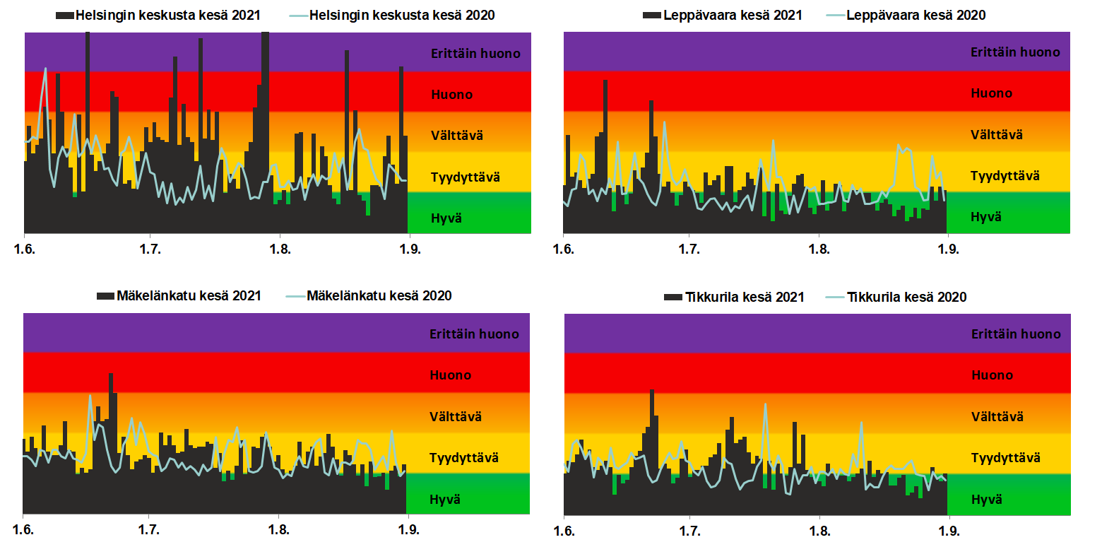 Liikenneympäristöjen ilmanlaatu oli melko samankaltainen kuin kesällä 2020 lukuun ottamatta Helsingin keskustan Mannerheimintien mittauspistettä, jossa ilmanlaatu heikkeni ajoittain jopa erittäin huonoksi (kuva 3.4). Mannerheimintiellä huonon ja erittäin huonon ilmanlaadun tunnit johtuivat pääasiassa hengitettävistä hiukkasista, joita työmaatoiminnot nostattivat ilmaan.