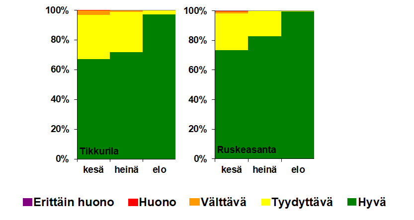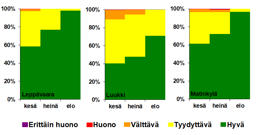 Kesän ilmanlaatu oli pääkaupunkiseudulla suurimman osan ajasta tavanomaiseen tapaan hyvä tai tyydyttävä. Kesällä ilmanlaatu oli hyvä tai tyydyttävä yli 90 % ajasta kaikilla muilla mittausasemilla paitsi Helsingin keskustassa Mannerheimintiellä ja Espoossa Luukissa (kuva 3.1.1, 3.1.2 ja 3.1.3.). Sää ja päästöt vaikuttavat ilmanlaatuun, ja lomakaudella ilmanlaatu onkin yleensä vuoden puhtainta. HSY:n mittausten mukaan kesäkuu oli ilmanlaadultaan hiukan heinä- ja elokuuta huonompi.