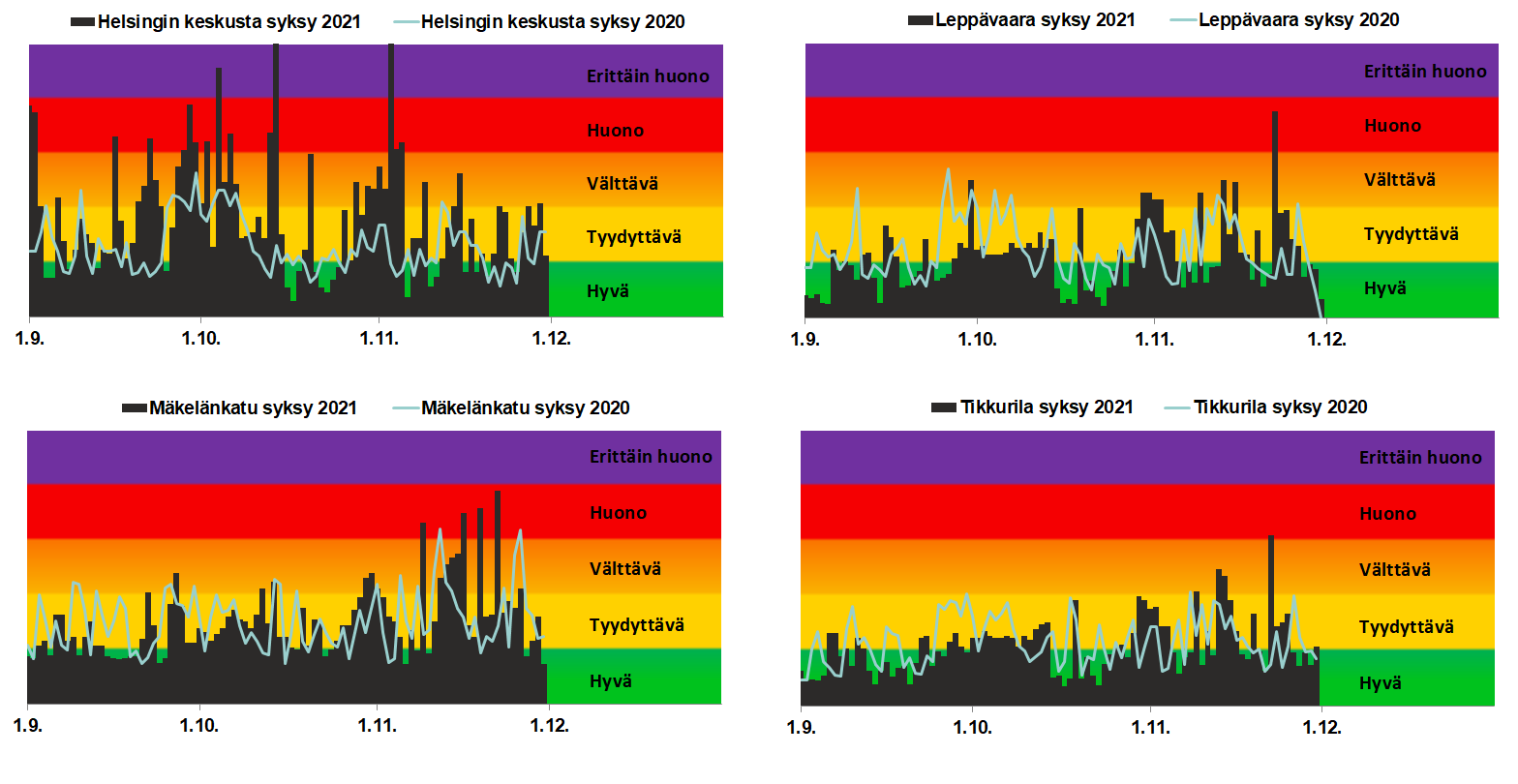 Liikenneympäristöjen ilmanlaatu oli syksyllä 2021 huonompi kuin edellisvuonna, jolloin liikennemäärät olivat pääkaupunkiseudulla tavanomaista alhaisempia ja syksyn 2020 lämpötilat olivat myös tavanomaista leudommat (kuva 4.1.5.). Helsingin keskustan huonoon ilmanlaatuun vaikutti läheinen korjausrakentamisen työmaa, jonka toiminnot nostattivat hiukkasia ilmaan. Korjausrakentaminen alkoi Mannerheimintien mittausaseman läheisyydessä kesällä 2021.