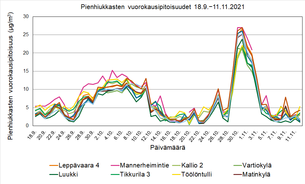 Pienhiukkasten vuorokausipitoisuudet ylittivät syksyllä WHO:n terveysperusteisen vuorokausiohjearvotason, joka on 25 µg/m3 (saa ylittyä 3 kertaa vuodessa). Taso ylittyi Katajanokalla sekä Matinkylässä kerran, Ruskeasannassa, Leppävaarassa sekä Mäkelänkadulla 2 kertaa ja Mannerheimintiellä 3 kertaa. Mannerheimintiellä varsinainen ohjearvo ylittyi marraskuussa, kun ohjearvotason ylityksiä on ollut vuoden aikana 4.