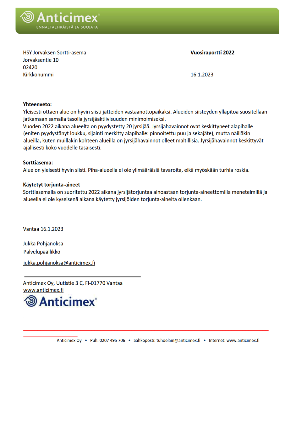 Liite 5 Jorvaksen Sortti-aseman hygieniaraportti vuodelta 2022