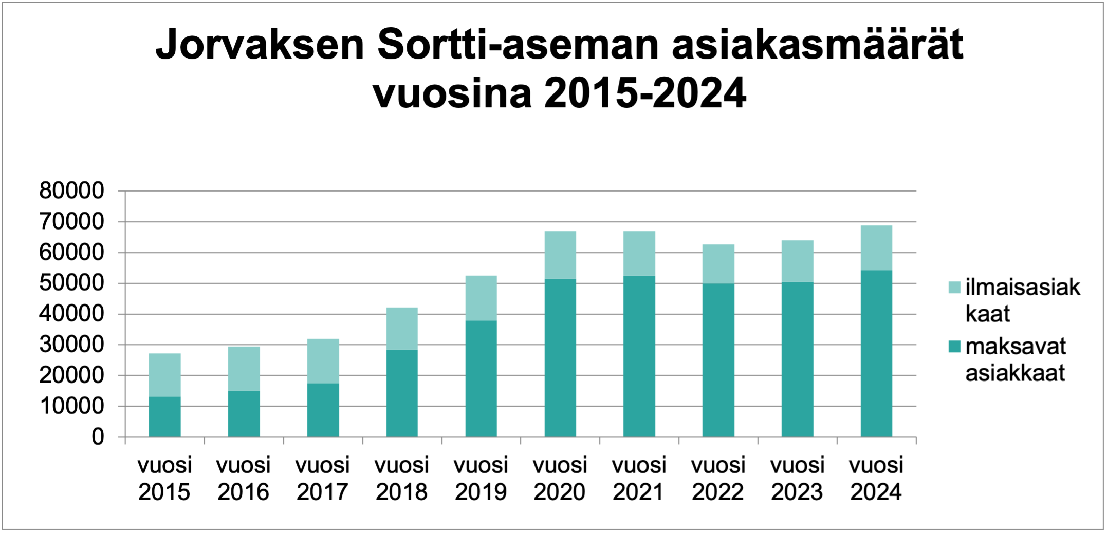 Vuonna 2024 Jorvaksen Sortti-asemalla kävi 68 744 asiakasta, kun edellisvuonna kävijämäärä oli 63 948. Kävijämäärät on esitetty kuvassa 1 sekä liitteessä 4.