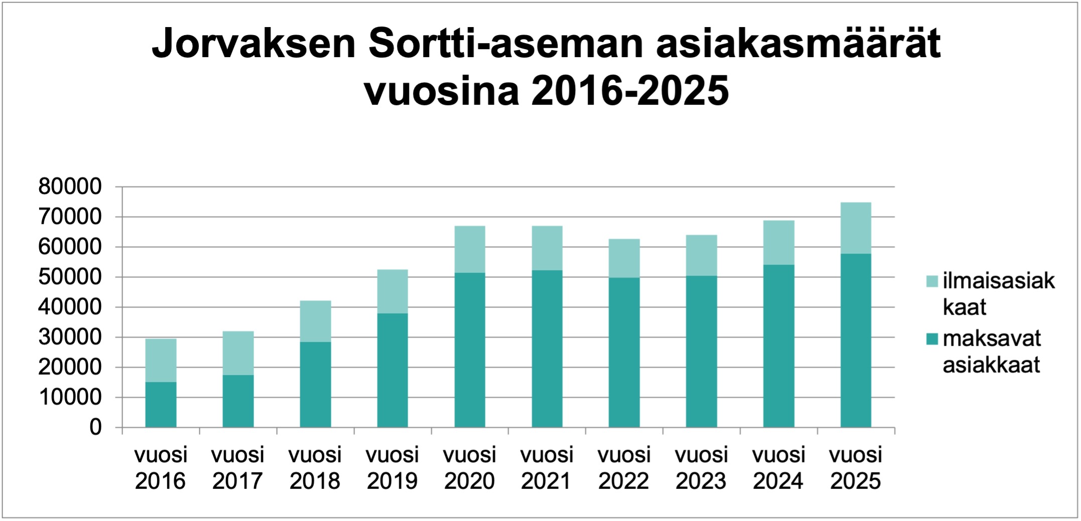 Vuonna 2025 Jorvaksen Sortti-asemalla kävi 74 876 asiakasta, kun edellisvuonna kävijämäärä oli 68 744. Kävijämäärät on esitetty kuvassa 1 sekä liitteessä 1.