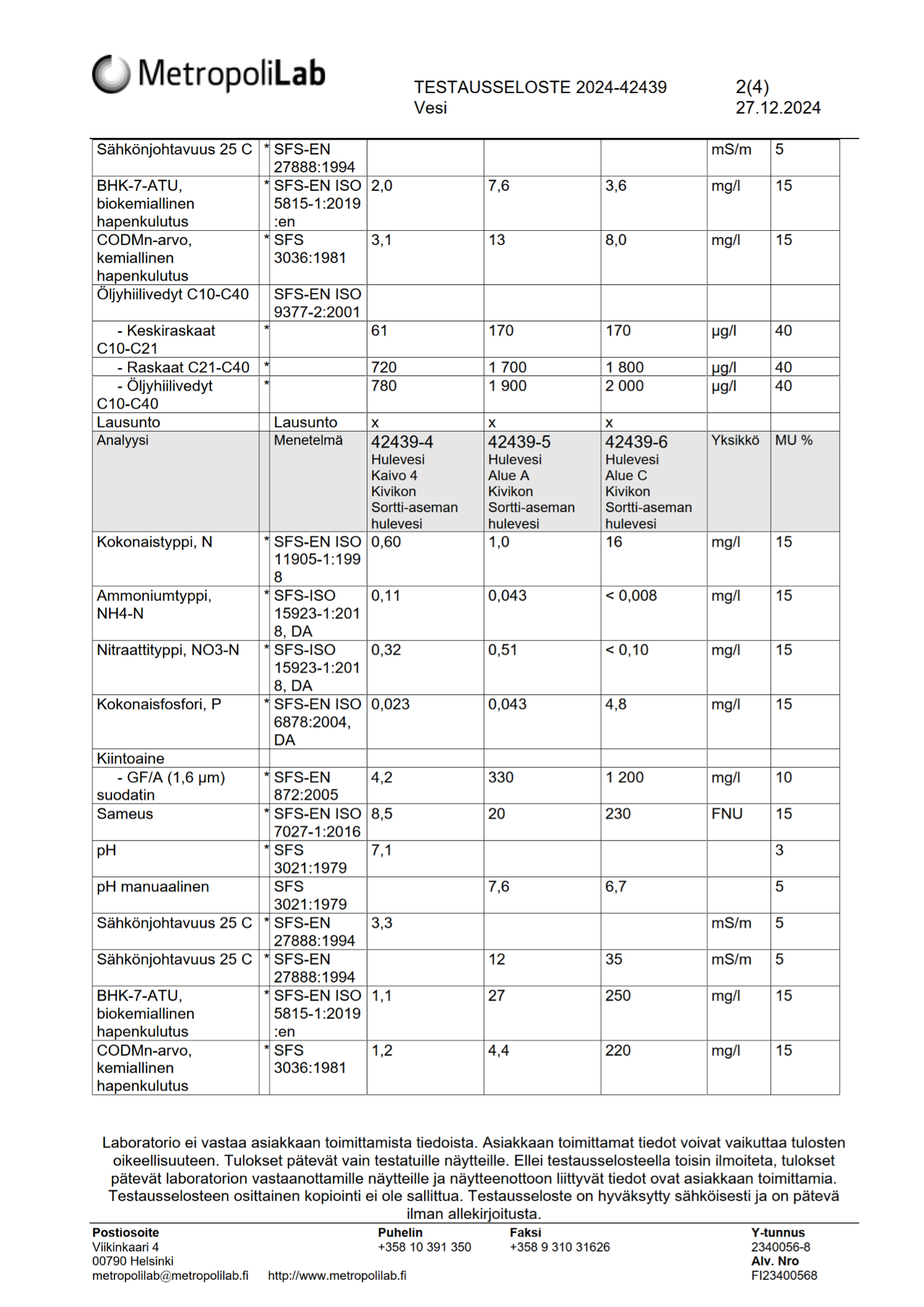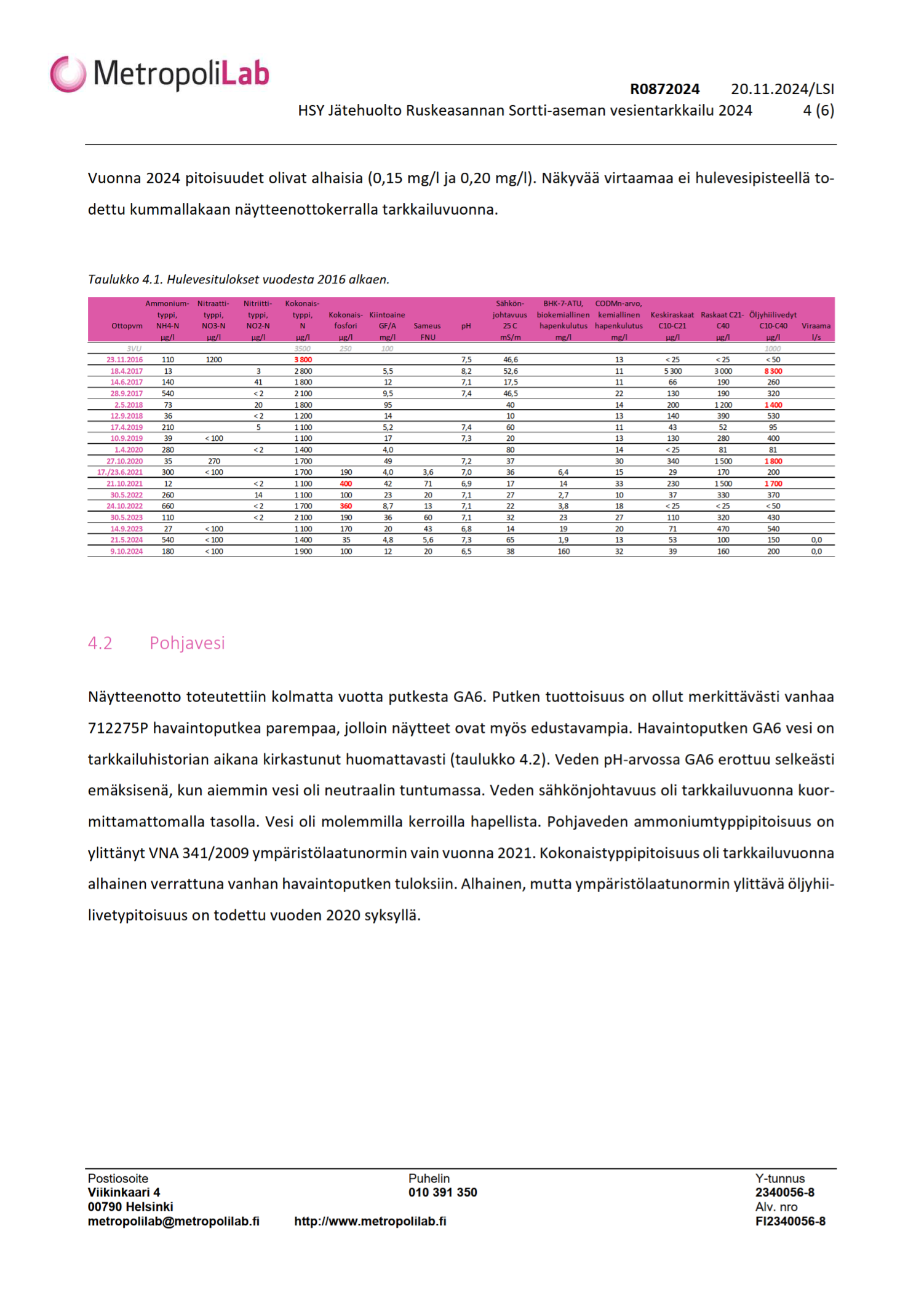 Liite 5 b Ruskeasannan Sortti-aseman hule- ja pohjaveden testausseloste, lokakuu 2024