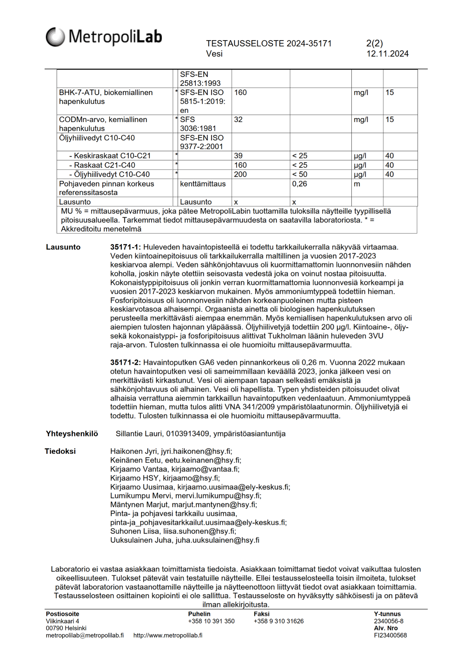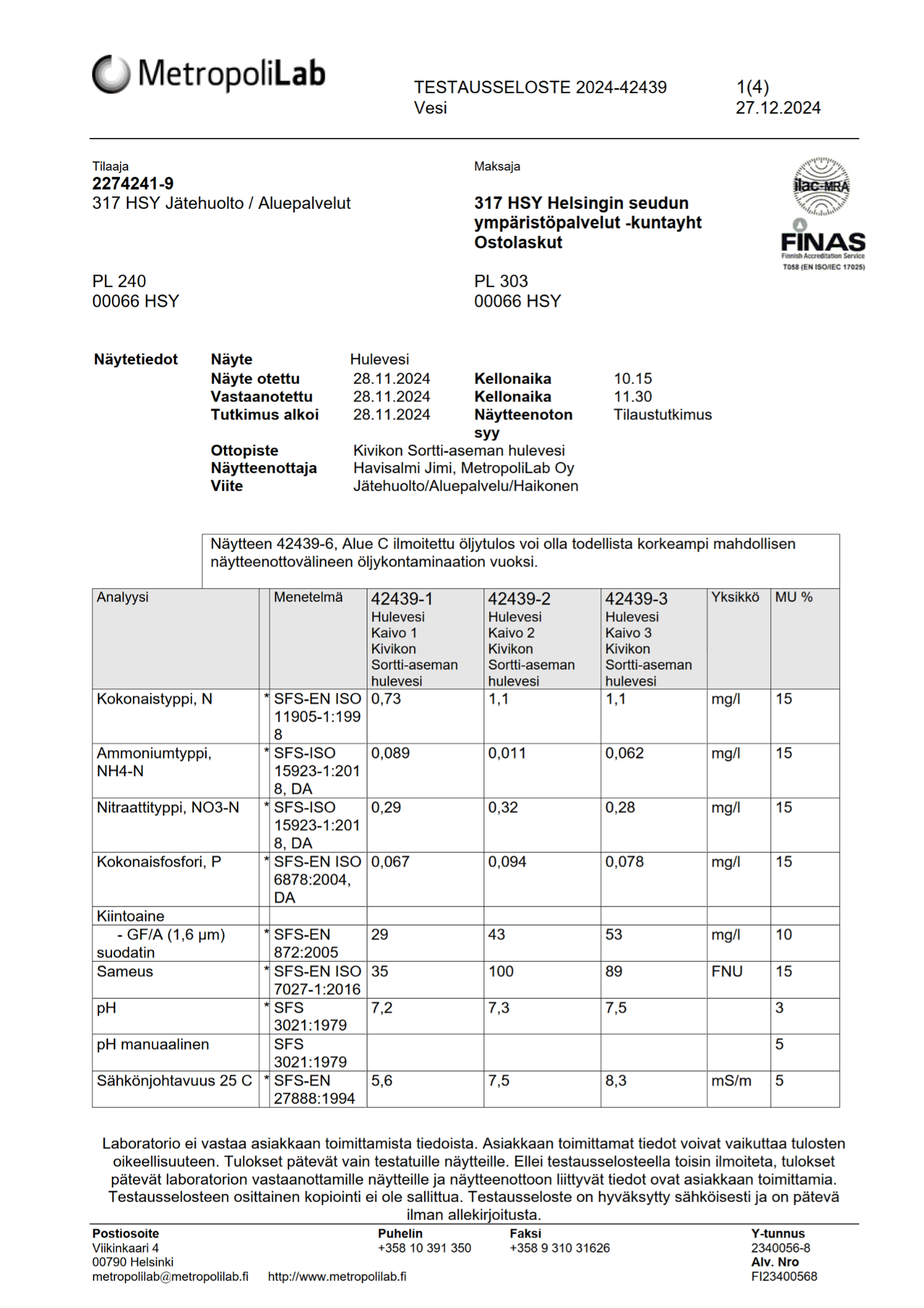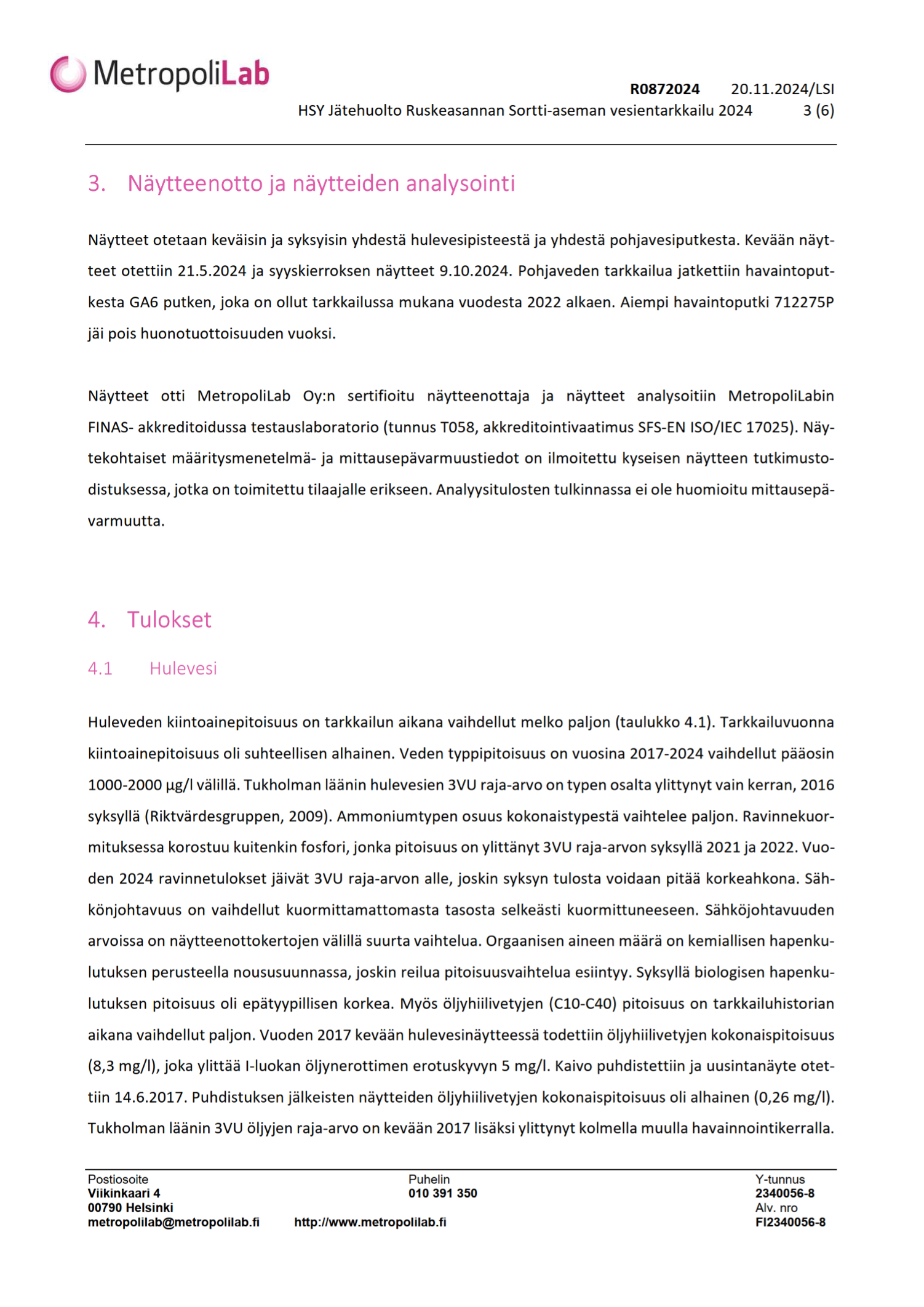 Vuonna 2024 hulevesinäytteenotot ja laboratorioanalyysit teki MetropoliLab Oy. Kevään näytteet otettiin 21.5.2024 ja syyskierroksen näytteet 9.10.2024.