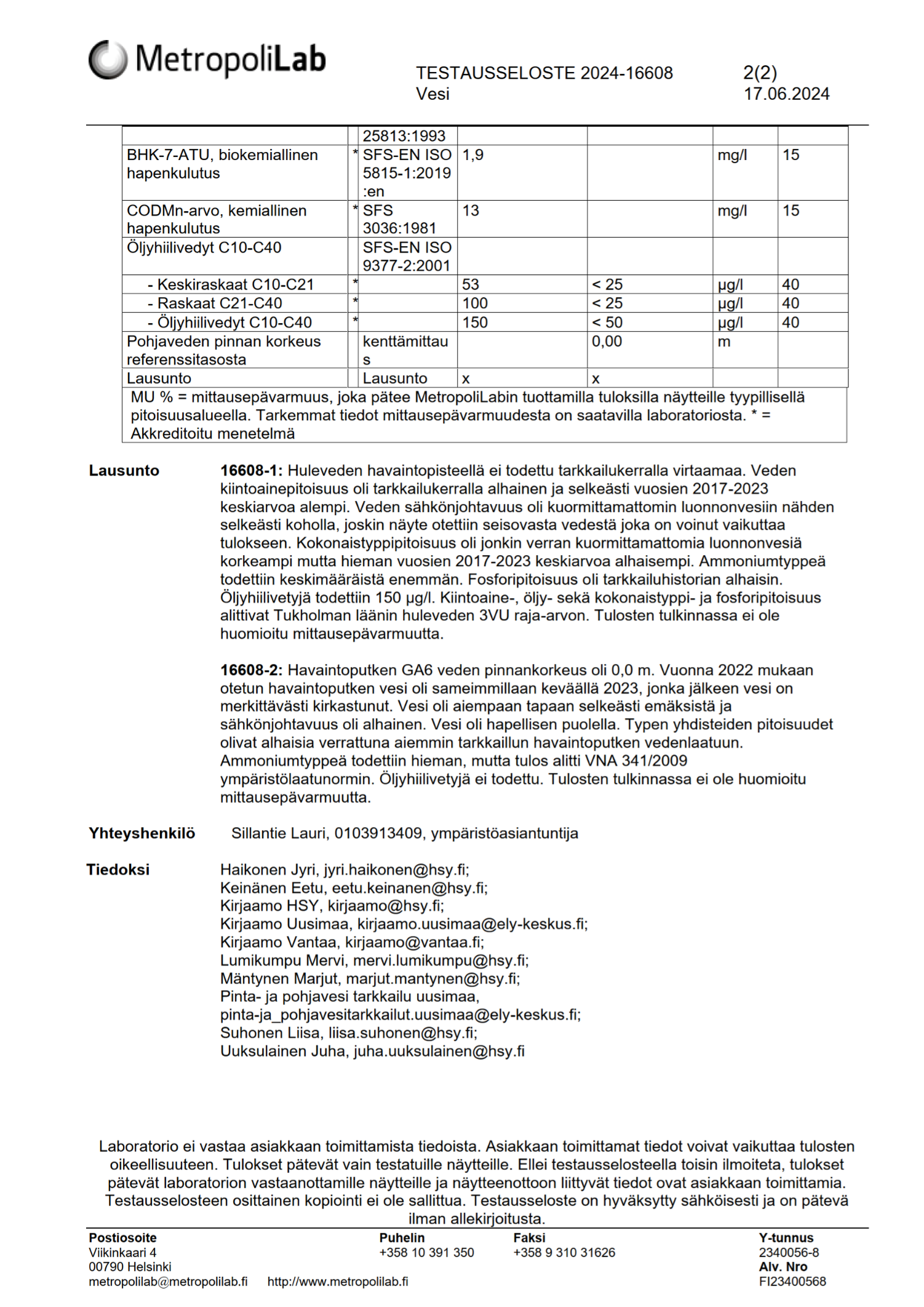 Pohjavesinäytteenotot ja laboratorioanalyysit teki MetropoliLab Oy. Kevään näytteet otettiin 21.5.2024 ja syyskierroksen näytteet 9.10.2024.