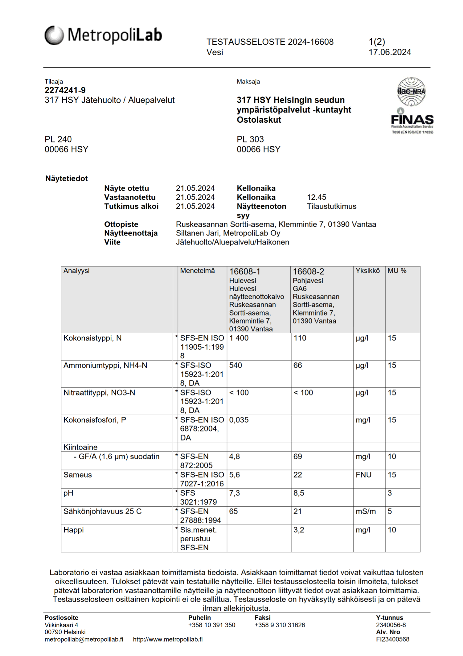 Liite 5 a Ruskeasannan Sortti-aseman hule- ja pohjaveden testausseloste, toukokuu 2024