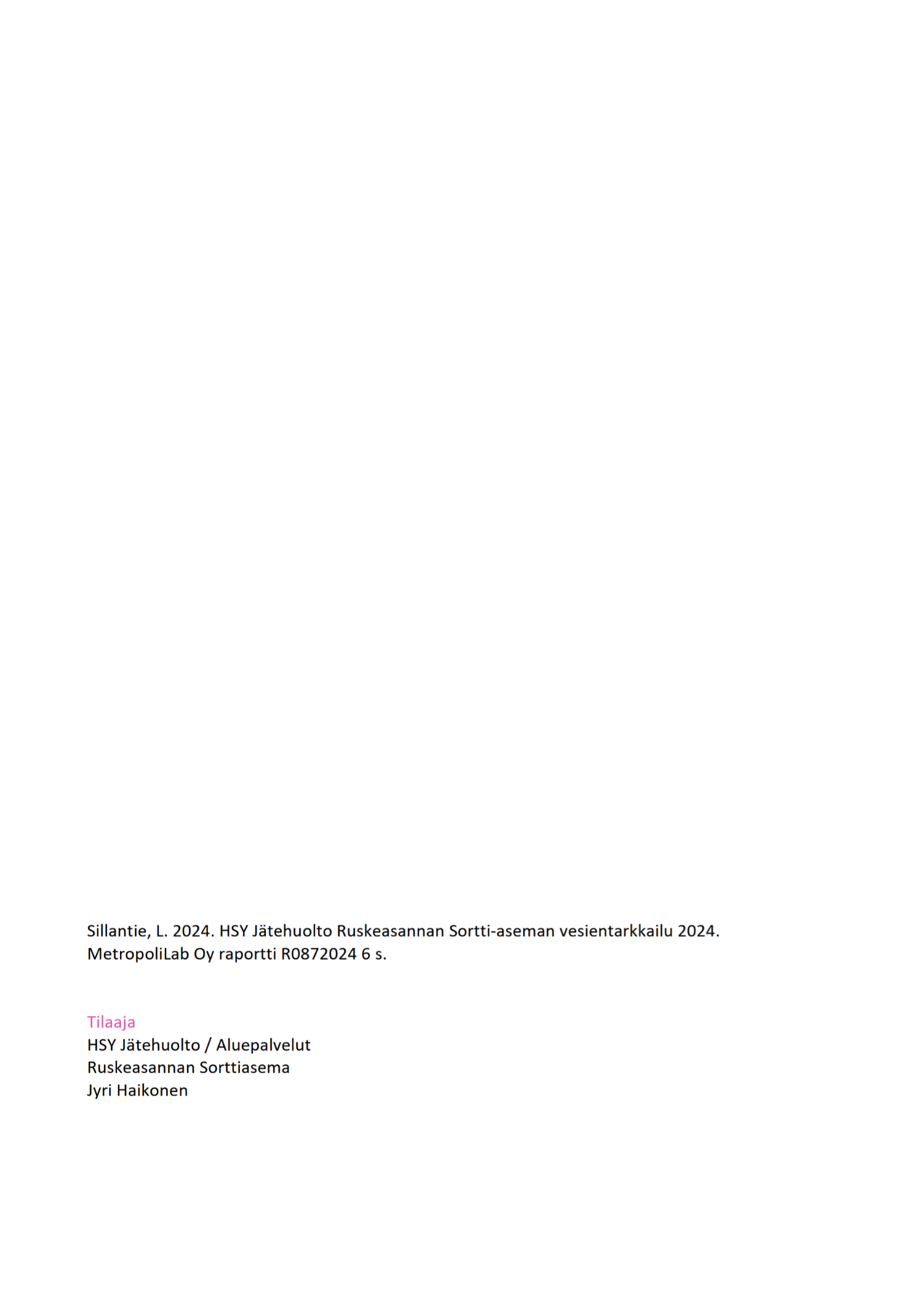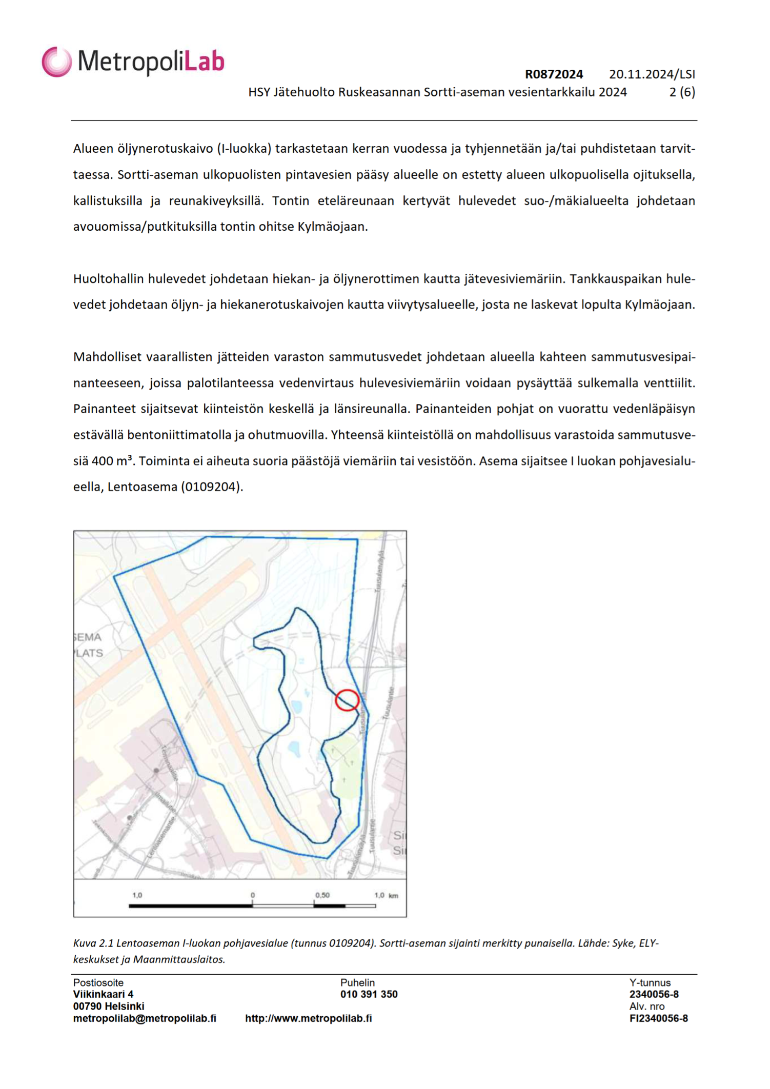 MetropoliLab Oy laati Ruskeasannan Sortti-aseman vuoden 2024 vesientarkkailuista yhteenvetoraportin, joka löytyy liitteestä 5 d.