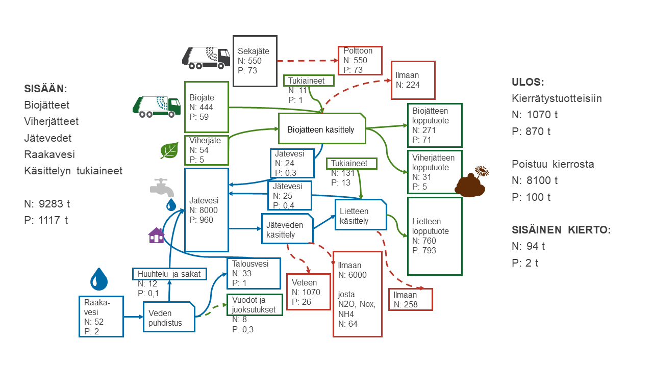 Ravinnetaseen laskennan yhteydessä kuvattiin HSY:n sisäistä ravinnekiertoa. Ravinnekierron kuvaaminen antaa apuvälineitä ravinnekierron kehittämiseksi tulevaisuudessa. Tiedot ovat laskennallisia ja perustuvat osittain arvioihin, keskimääriin ja massataseisiin. Sisään tulevia massoja ei myöskään kokonaisuudessaan käsitellä saman kalenterivuoden aikana. Fosforin ravinnekierron taso on kiitettävä, ja noin 80 prosenttia vastaanotetusta fosforista jatkaa HSY:stä eteenpäin muodossa, joka mahdollistaa ravinnekierron. HSY:n jätevedenpuhdistamoiden luontoon laskeman puhdistetun jäteveden fosforimäärä on kansallista suositusta pienempi. Typen kierrätysaste on noin 12 prosenttia. Suurin osa typestä haihtuu ilmaan vaarattomana typpikaasuna jätevedenpuhdistamon prosesseissa, joissa päätavoite on poistaa typpi mereen päätyvästä vedestä. Jätehuollon suurin ravinnehukka on lajittelematon biojäte, joka sekajätteen seassa päätyy jätevoimalaan. Tämä on noin puolet jätehuollon ravinnevirroista. Typen ja fosforin ravinnekierron parantamiseksi vaikuttava toimi olisi HSY:n alueen kierrätysasteen nostaminen ja etenkin biojätteiden parempi kierrätys. Tämän eteen tehdään paljon töitä muun muassa jätehuoltomääräysten, kampanjoinnin, viestinnän ja neuvonnan keinoin.