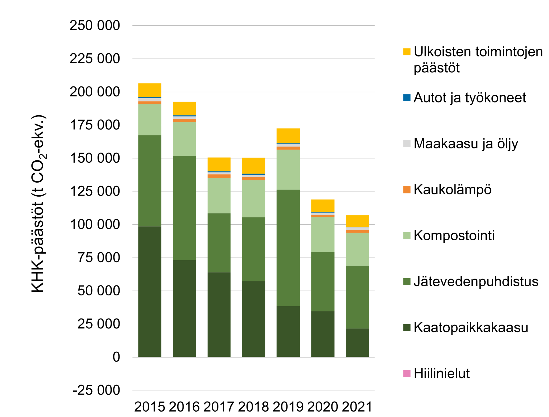 Toimintamme suorat kasvihuonekaasupäästöt laskivat vuonna 2021 noin kymmenen prosenttia edellisvuodesta. Eniten vähenivät kaatopaikan hajapäästöistä aiheutuvat kasvihuonekaasupäästöt. Myös kompostoinnin sekä ajoneuvojen ja työkoneiden aiheuttamat päästöt olivat laskusuunnassa edellisvuoteen nähden. Toisaalta kaukolämmön sekä maakaasun ja öljyn käytöstä aiheutuneet päästöt nousivat vuoteen 2020 verrattuna. Oman toimintamme suorat sekä ulkoisten palvelujemme kasvihuonekaasupäästöt olivat viime vuonna yhteensä 107 000 tonnia hiilidioksidiksi muutettuna.