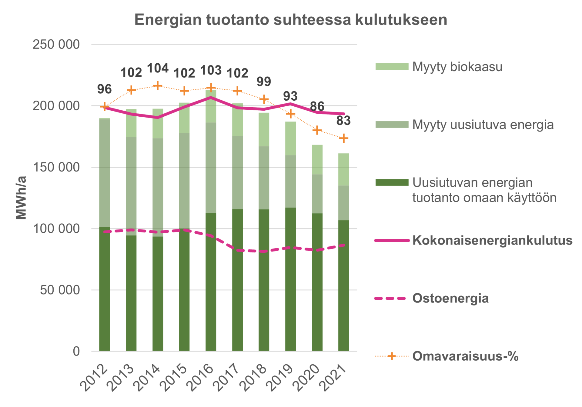 Suurin osa kuluttamastamme energiasta oli peräisin omasta energian tuotannostamme. Myymme uusiutuvaa energiaa ja biokaasua myös muiden käyttöön. Vuonna 2021 uusiutuvan energian kokonaistuotantomme oli 161 000 megawattituntia. Kun verrataan uusiutuvan energian tuotantoa ja kulutustamme, olimme 83-prosenttisesti nettoenergiaomavaraisia vuonna 2021.