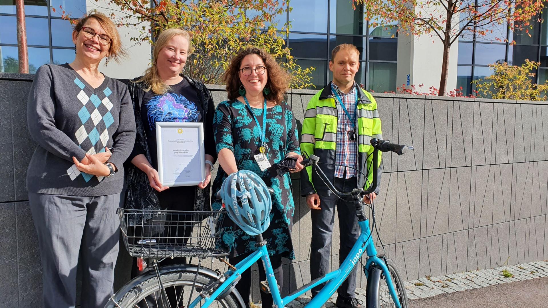 Saimme vuonna 2021 Työmatkaliikkumisen edelläkulkija -tunnustuksen. HSL ja Fiksusti töihin -hanke myöntävät tunnustuksen sellaiselle HSL-alueen työnantajalle, joka edistää esimerkillisesti kestävää työmatka- ja työasiointiliikkumista.
