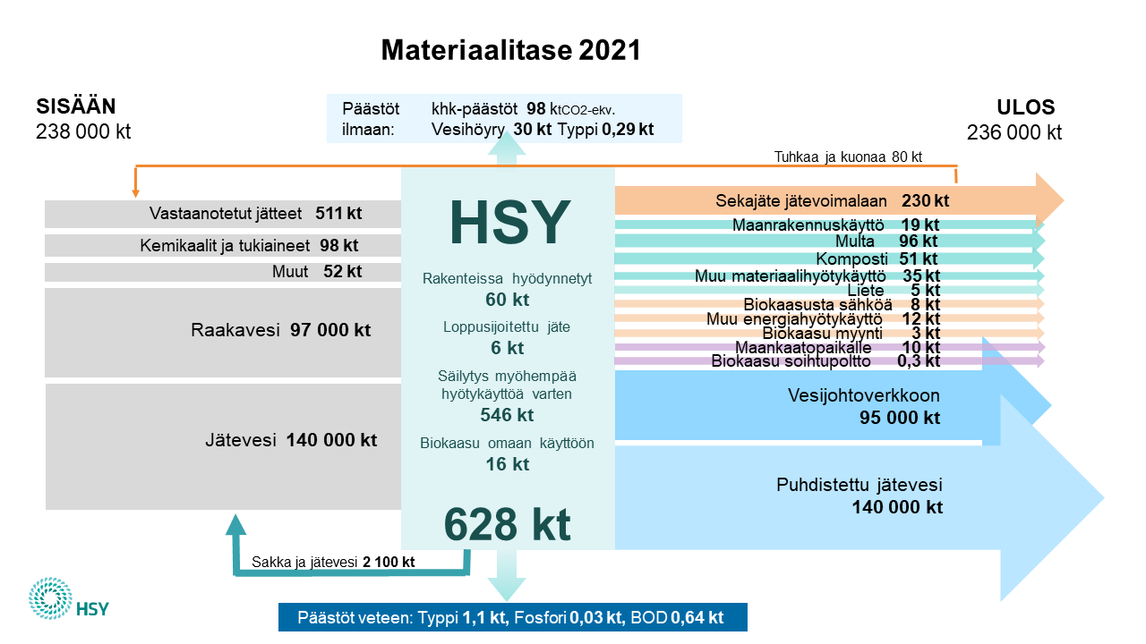 Vuonna 2021 otimme vastaan noin 238 miljoonaa tonnia materiaalia, noin 6 prosenttia vähemmän kuin vuonna 2020. Jopa 99 prosenttia vastaanottamastamme materiaalista on vettä. Vastaanotimme yhteensä 661 000 tonnia kiinteitä materiaaleja, joista suurin osa oli vastaanotettuja jätteitä. Vain noin prosentti kaikesta vastaanotetusta jätteestä päätyi loppusijoitukseen. Vuonna 2021 hyödynsimme erilaisia massoja yhteensä noin 60 000 tonnia Ämmässuon jätteenkäsittelykeskuksen kaatopaikka- ja ympäristörakenteissa sekä seudun vesijohtoverkoston kaivannoissa. Keräsimme lisäksi yhteensä noin 16 000 tonnia biojätteen ja jätevedenpuhdistuksen lietteen mädätyksessä syntyvää biokaasua ja Ämmässuon jätteenkäsittelykeskuksen kaatopaikalta kerättyä kaatopaikkakaasua. Kaasusta tuotettiin pääosin energiaa, joka käytettiin HSY:n omassa toiminnassa tai myytiin sähkönä valtakunnan verkkoon.